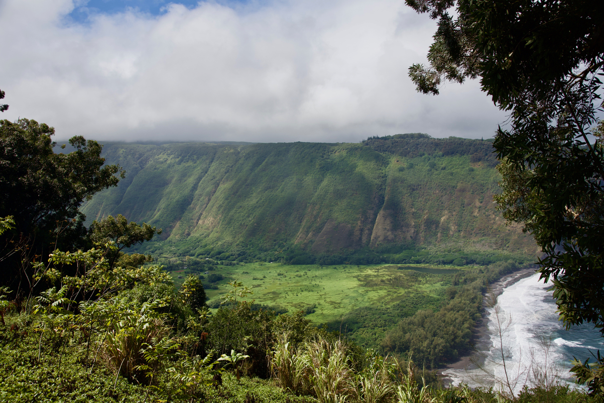 Kona, HI doesn’t get a lot of rain, but as the fates would allow our departure day saw the west and north side of the island get just about their month’s worth of the wet stuff on our travel day to the east side of the island. The rain hampered our hope of hiking down the trail at the Pololu Valley Lookout, but our travel around the north of the island, over to Hilo, and down to our “treehouse” in Volcano was just as adventure-filled as our Day 2 adventure along the west coast.